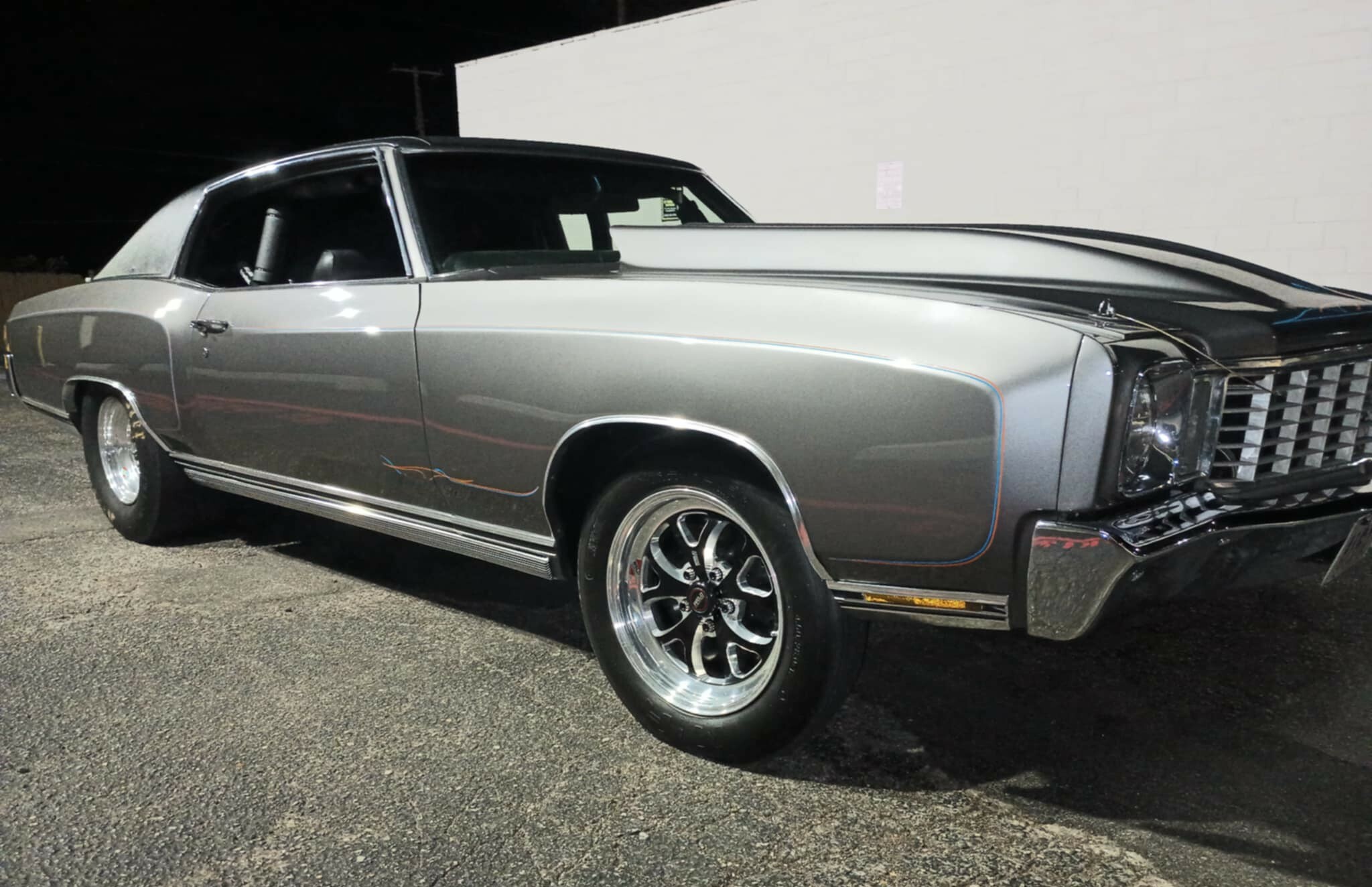 ”1972 Monte Carlo. Pro-street. Street-driven race car. Full interior with 12-point roll cage, bench seat, and rear seat. Dart 434 cubic inch motor, turbo 350 transmission with trans brake, 3800 stall converter, 430 gear with a Dana Super 60, narrowed rear end with ladder bar and coil overs. 29.0/15.0-15 tires on rear.”